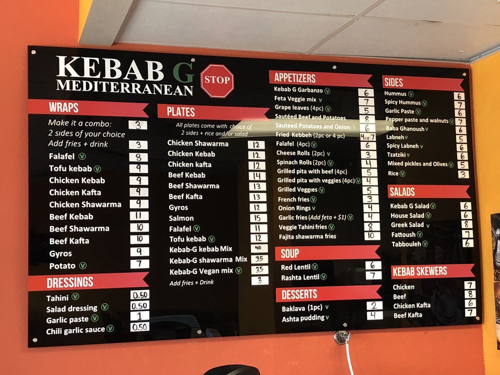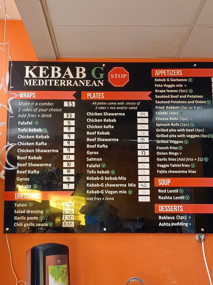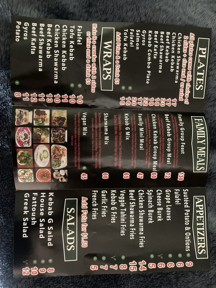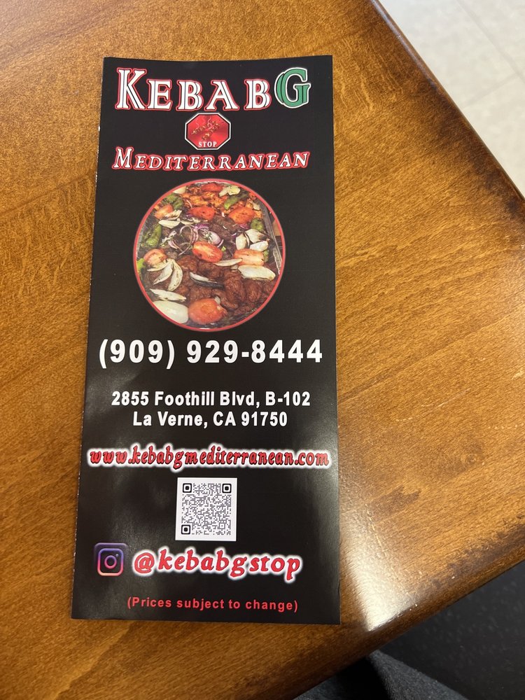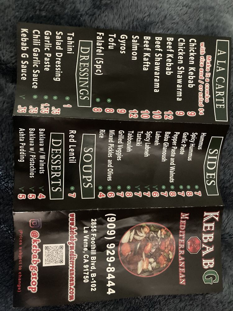 Introducing the menu at Kebab G Stop! Located in La Verne, CA, this Mediterranean gem offers a range of delicious options for diners. From appetizers like Grape Leaves and Garlic Fries to hearty soups like Red Lentil Soup, there's something for everyone. The salads, including Tabbouleh and Fattoush, are fresh and flavorful. Customer reviews rave about the Beef Kabob Plate, Chicken Shawarma, and the must-try Garlic Paste. Prices may be on the higher side, but the quality and portions make it worth it. With attentive service and a cozy dining area, Kebab G Stop is a must-visit for Mediterranean food lovers. Don't miss out on their Best Hummus and unique Tofu Kabobs – a perfect choice for vegetarians! Enjoy a satisfying meal with the perfect blend of flavors and a cozy ambiance.