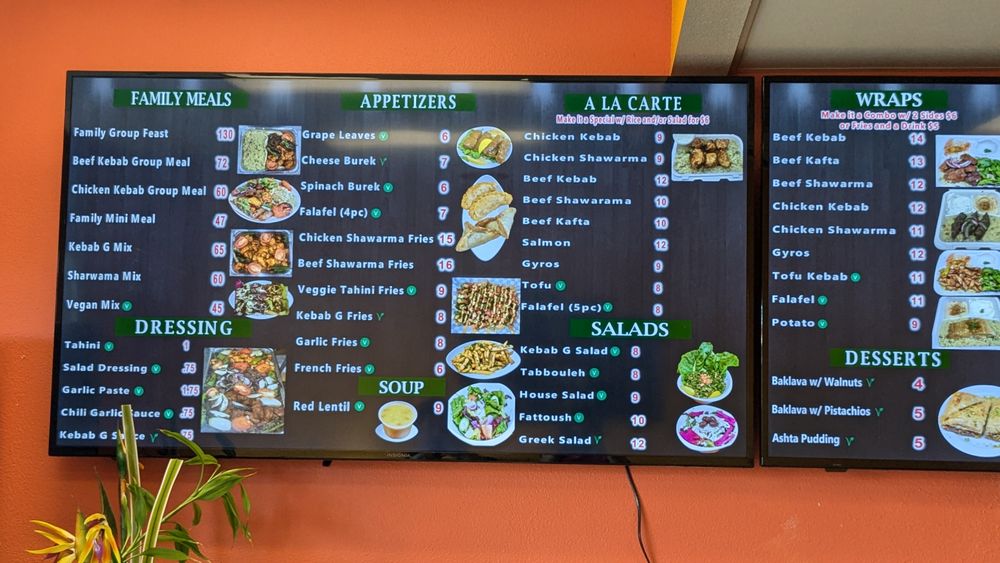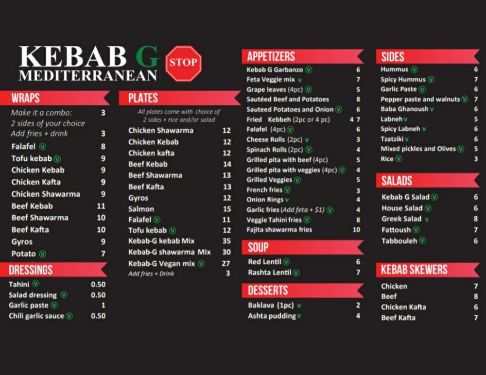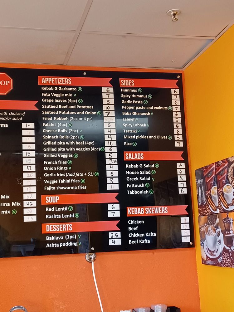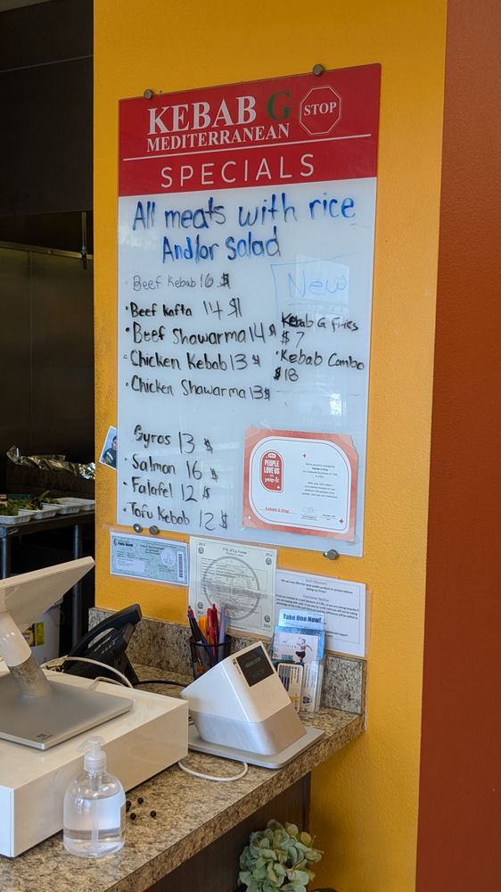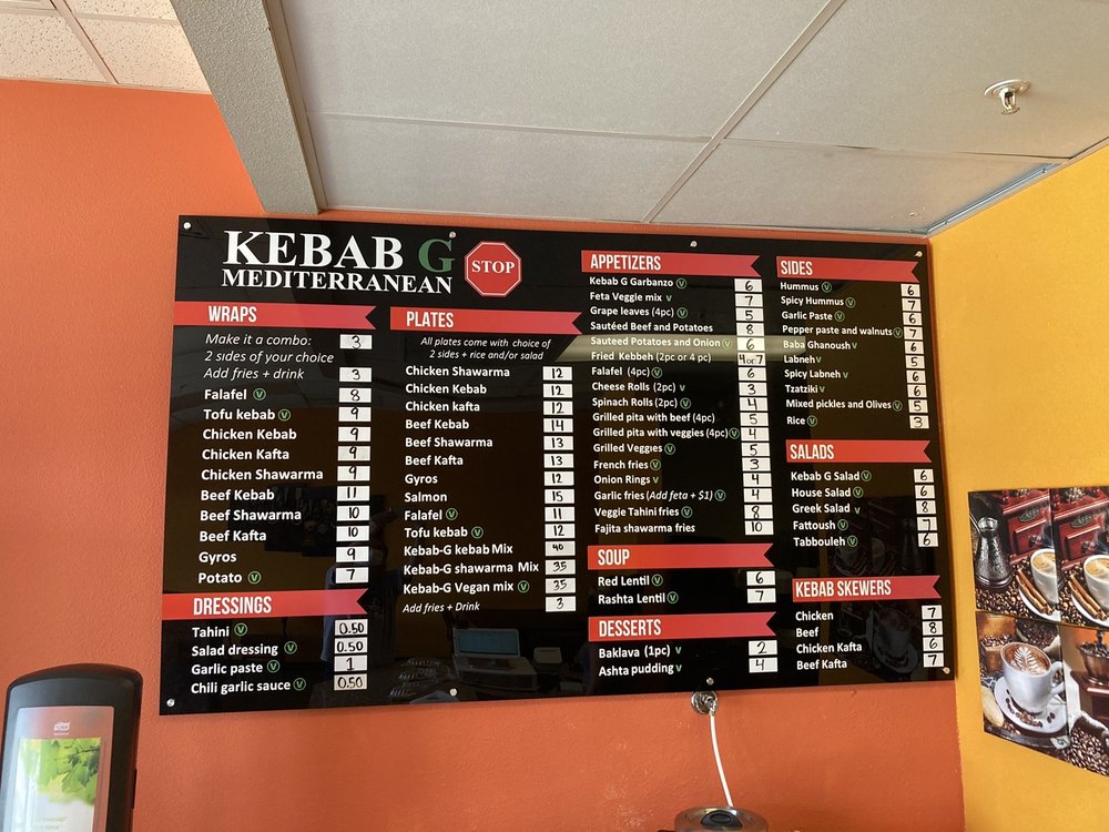 Introducing the menu at Kebab G Stop! Located in La Verne, CA, this Mediterranean gem offers a range of delicious options for diners. From appetizers like Grape Leaves and Garlic Fries to hearty soups like Red Lentil Soup, there's something for everyone. The salads, including Tabbouleh and Fattoush, are fresh and flavorful. Customer reviews rave about the Beef Kabob Plate, Chicken Shawarma, and the must-try Garlic Paste. Prices may be on the higher side, but the quality and portions make it worth it. With attentive service and a cozy dining area, Kebab G Stop is a must-visit for Mediterranean food lovers. Don't miss out on their Best Hummus and unique Tofu Kabobs – a perfect choice for vegetarians! Enjoy a satisfying meal with the perfect blend of flavors and a cozy ambiance.